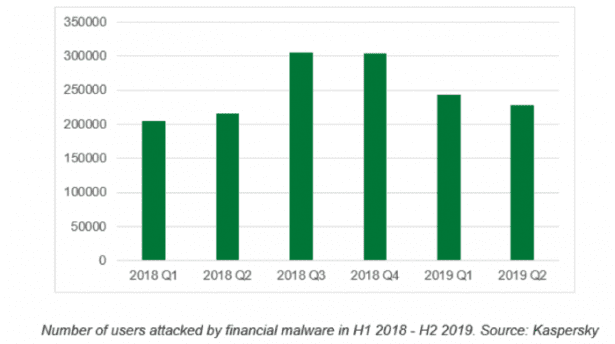 Volgens Kaspersky-onderzoek zijn wereldwijd zo’n 430.000 internetgebruikers in de eerste helft van 2019 getroffen door malware gericht op het stelen van financiële gegevens, digitale valuta of andere online betalingsdiensten. Dat is 7% meer dan in dezelfde periode van 2018. Het aantal zakelijke slachtoffers is verdubbeld met 30,9% waar dat vorig jaar nog 15,3% was.