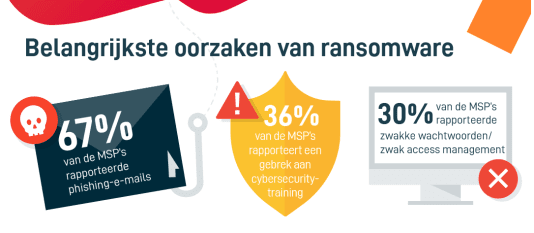Een van de meest simpele en effectieve maatregelen voor het voorkomen van ransomware wordt onderbenut: MSP’s geven aan bij slechts 60 procent van de e-mail-clients en bij 61 procent van de passwordmanagers twee-factor-authenticatie in te richten, ondanks het feit dat de meerderheid van de MSP’s (67 procent) beweert dat phishing-e-mails de belangrijkste oorzaak zijn van succesvolle ransomware-aanvallen bij het kmo.