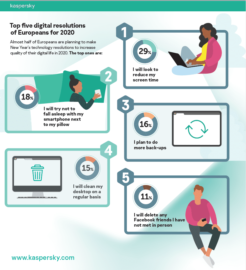 Het Kaspersky-onderzoek toont aan dat mensen dit jaar meer willen doen om hun online gezondheid en privacy te waarborgen. Digitale detox staat hoog op het lijstje, zo zegt 29% van de respondenten de schermtijd te willen verminderen en valt 18% liever niet meer in slaap met de smartphone naast het kussen. Een meer cyber-savvy levensstijl lijkt een trend te worden in 2020. Een kwart van de respondenten kiest er namelijk voor om meer back-ups te maken en hun desktop regelmatig op te schonen. Daarnaast is 11% van plan om de Facebook-vrienden, die ze nooit persoonlijk hebben ontmoet, te verwijderen.