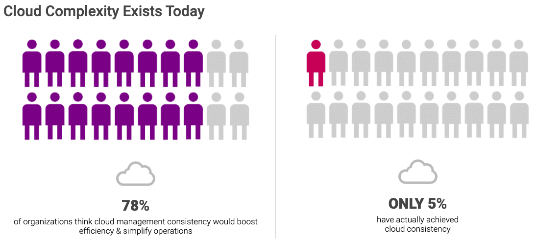 Ondanks dat een groeiend aantal organisaties workloads bij public cloud providers onderbrengt, blijkt uit het onderzoek dat ze ook zorgen dat ze hun on-premises-infrastructuur doorontwikkelen. Dit om een flexibele aanpak te behouden voor het consumeren van infrastructuur, net als in de public cloud. Fragmentatie ligt dan op de loer en organisaties stoeien daardoor met steeds complexere multi-cloud-omgevingen. Wereldwijd zegt 73% van de organisaties dat de inzet van public cloud of meerdere cloud-diensten naast de on-premises-infrastructuur meer complexiteit heeft toegevoegd aan hun IT-operations.