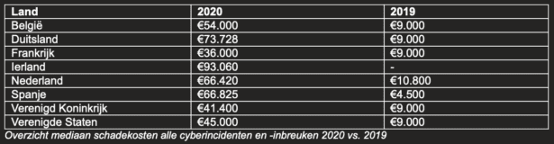 De financiële gevolgen verschillen per sector, bedrijf en land. Ierland voert echter de landenranglijst aan: het gemiddelde Ierse bedrijf rapporteerde €93.000 aan kosten voor cyberincidenten. Duitsland staat op de tweede plaats (€74.472), gevolgd door Spanje (€67.500). Nederland staat op de vierde plaats in de ranglijst met een mediaan schadepost van 67.000 euro. Een aantal organisaties kreeg zelfs te maken met extreme financiële consequenties. Een Britse financiële dienstverlener meldde dit jaar de hoogste schadepost. Meerdere cyberaanvallen kostte de organisatie in totaal 79,9 miljoen euro. In ons land kostte één incident een organisatie ruim een half miljoen euro.