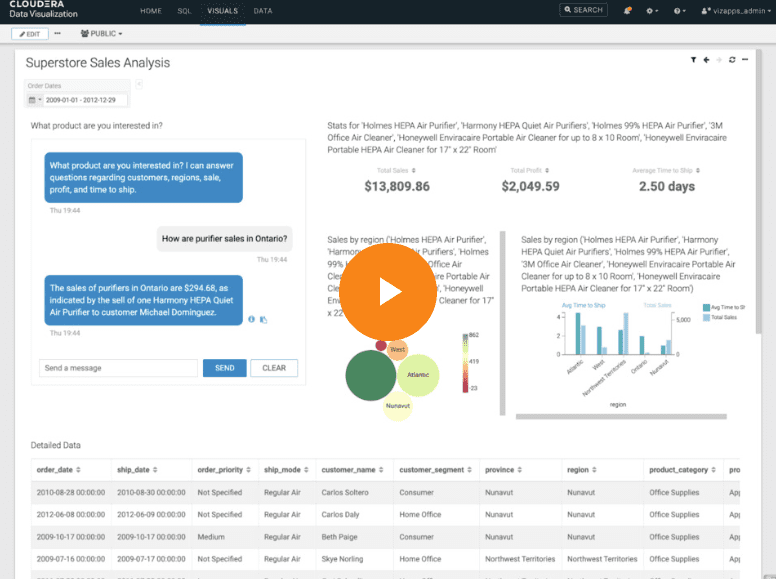 • AI Chatbot in Cloudera Data Visu­a­li­za­tion: Cloudera’s AI Chatbot in Cloudera Data Visu­a­li­za­tion is ontworpen om direct met bedrijfs­ge­ge­vens te commu­ni­ceren om gecon­tex­tu­a­li­seerde zakelijke inzichten te bieden die verder gaan dan wat BI-dash­boards doorgaans kunnen weergeven. Deze chatbot bevindt zich in het dashboard en de rapporten die zijn gemaakt met Cloudera Data Visu­a­li­za­tion. Het benut de context van alle beschik­bare data achter het dashboard, om diepere en beter bruikbare inzichten te leveren. Gebrui­kers kunnen eenvoudig vragen stellen in de eigen taal, waarna de AI-chatbot deze op intel­li­gente wijze aan relevante gegevens en beelden koppelt.