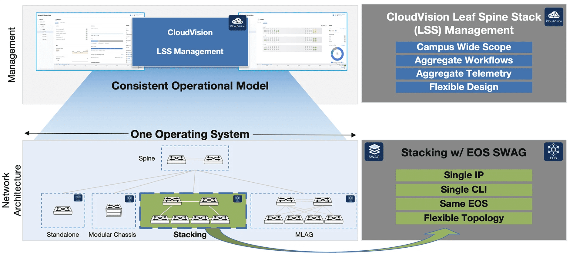 Arista Networks kondigt een aantal innovaties aan waarmee organisaties schaalbare en veerkrachtige campusnetwerken kunnen bouwen. Arista introduceert de Switch Aggregation Group (SWAG) mogelijkheid in Arista EOS die gebruik maakt van industriestandaard Ethernet om individuele switches te groeperen en te beheren via één IP-adres. Bovendien stelt CloudVision Leaf Spine Stack (LSS) Management netwerkoperators in staat om gezamenlijk een logische stack van switches te beheren binnen één MER (Main Equipement Room), of over de hele campus. Verder ontdoen Arista EOS, SWAG en CloudVision LSS klanten van gepatenteerde stackingprotocollen en ontwerpbeperkingen en bieden ze tegelijkertijd uitgebreide flexibiliteit voor alle netwerktopologieën en ‑operaties.