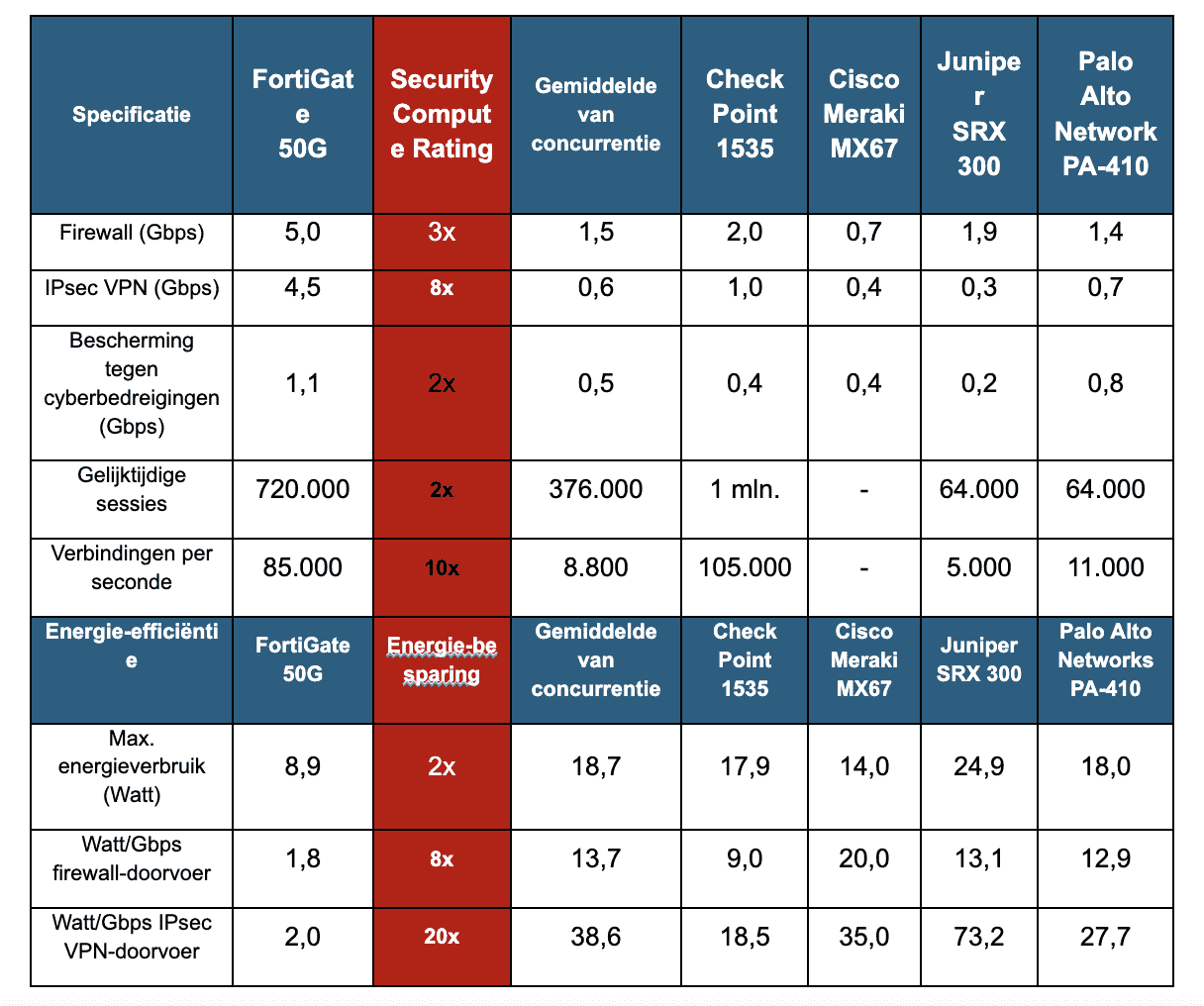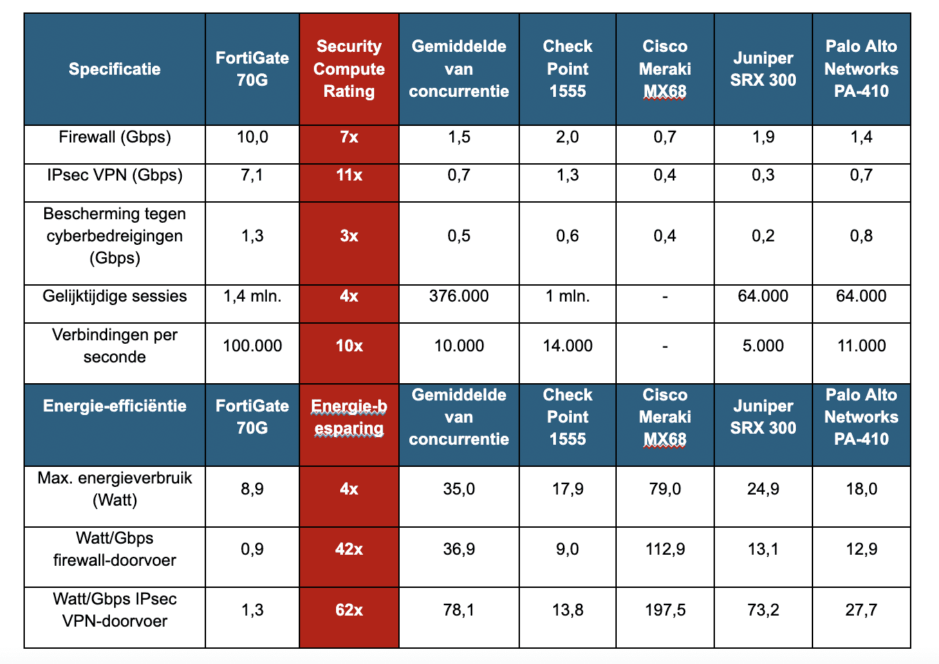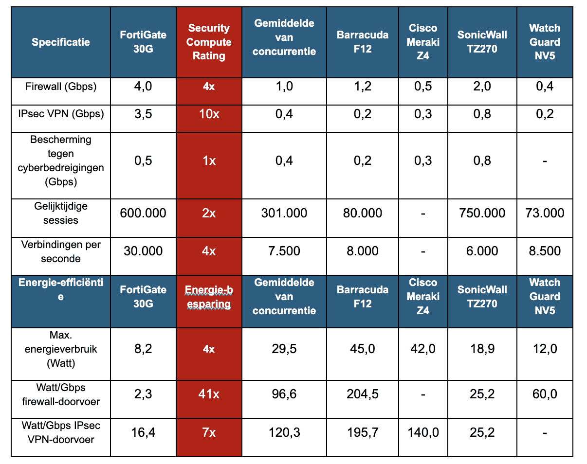 De kracht van de nieuwe FortiGate G‑serie en FortiGuard AI-Powered Security Services blijkt uit de in de onderstaande tabellen vermelde Security Compute Ratings. Daarin worden de prestaties van de populairste firewalls op de markt afgezet tegen de beoogde prestatiecijfers van de FortiGate 70G, FortiGate 50G en FortiGate 30G.