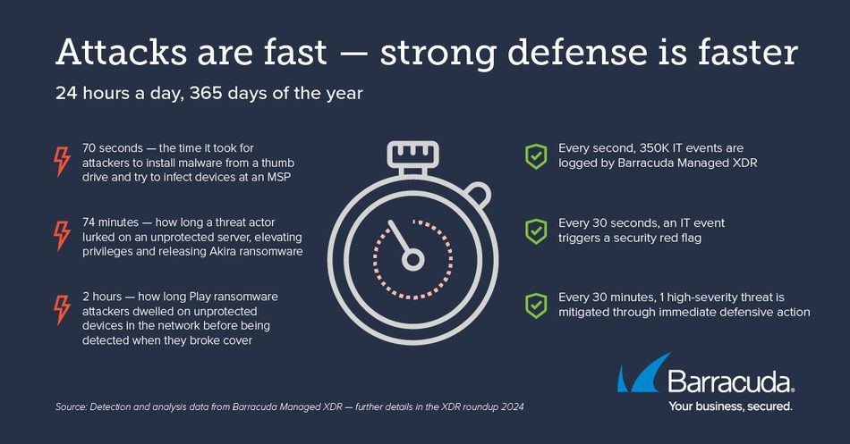 De gegevens laten ook zien hoe snel aanvallen zich ontwikkelden in 2024. Innovaties in securitytools en ‑strategieën betekenen dat aanvallers nu eenvoudiger en sneller worden gedetecteerd en verwijderd van het netwerk. In reactie hierop hebben zij hun aanvallen versneld. De detectiegegevens en incidentvoorbeelden in Barracuda Managed XDR uit 2024 laten zien hoe deze twee benaderingen zich tot elkaar verhouden.
