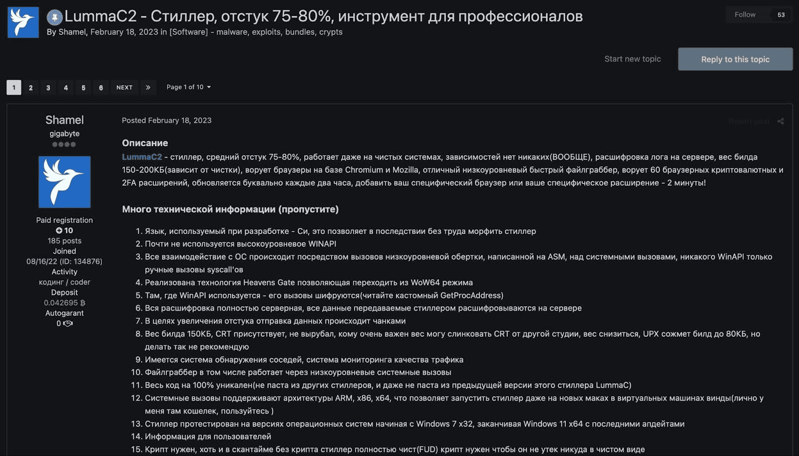 Exploit-lid Shamel plaatste de originele verkoopthread namens LummaC2