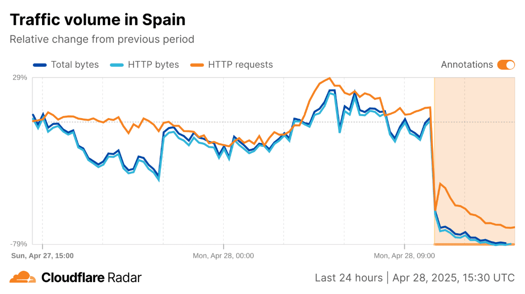 De grootste internetstoring door stroomuitval in het tweede kwartaal van 2025 was in een groot deel van Portugal en Spanje op 28 april. De impact van deze storing staat uitgebreid beschreven in de blog How the April 28, 2025, power outage in Portugal and Spain impacted Internet traffic and connectivity. Hierin worden de verschuivingen van het verkeer op land‑, netwerk- en regionaal niveau onderzocht en wordt uitgelegd welke impact de stroomstoring op de netwerkkwaliteit en de aangekondigde IP-adresruimte had. Vergeleken met de week ervoor daalde het internetverkeer in Portugal direct met ~50%, terwijl het binnen vijf uur ~90% lager was dan de week ervoor. Ook in Marokko, Puerto Rico, Saint Kitts en Nevis, Noord-Macedonië, Malediven en Curaçao heeft stroomuitval geleid tot internetstoringen.