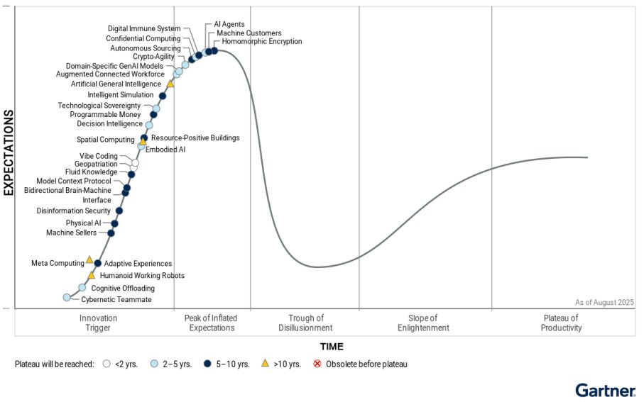 De Hype Cycle voor Opkomende Technologieën 2025 is uniek, omdat deze de belangrijkste inzichten destilleert uit meer dan 2.000 technologieën en toepassingskaders die Gartner jaarlijks analyseert. De geselecteerde technologieën kunnen de komende twee tot tien jaar transformatieve voordelen opleveren.