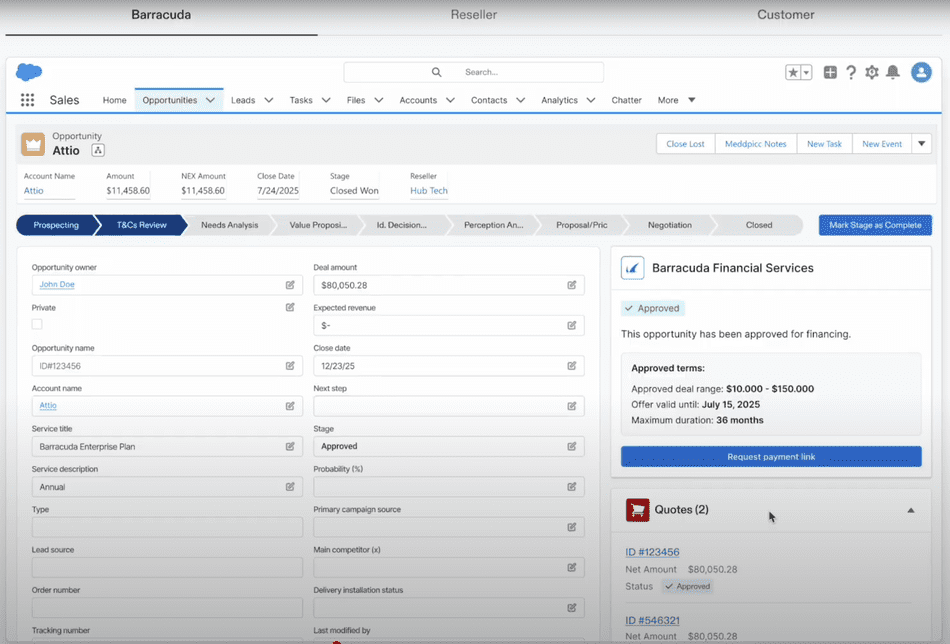 Barracuda Financial Services kan makkelijk worden geïntegreerd in bestaande workflows, zonder extra papierwerk of formaatwijzigingen. Het integreert digitale betaallinks rechtstreeks in verkoopprocessen, waardoor deals sneller kunnen worden afgesloten. Prekwalificatie- en goedkeuringsprocessen verlopen naadloos achter de schermen, waardoor salesteams zich kunnen focussen op de klantrelaties in plaats van op de logistiek rond de financiering.