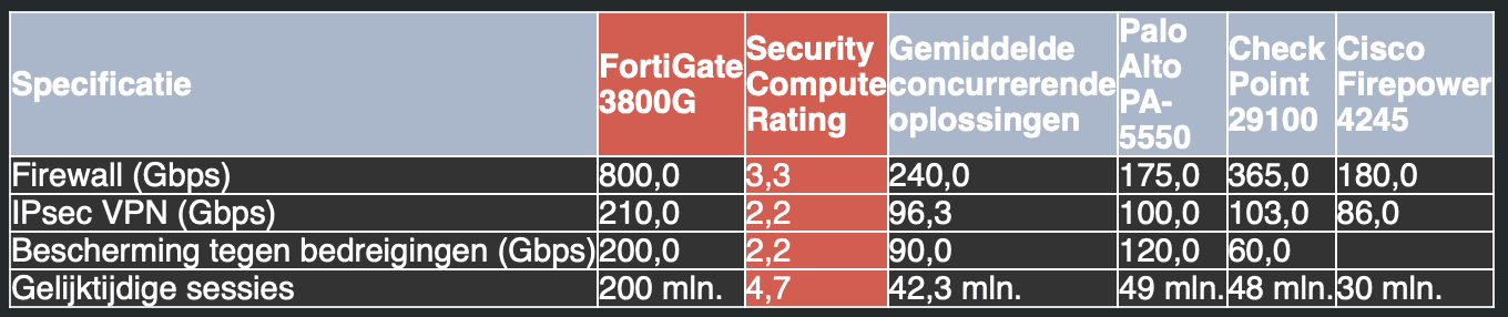 De kracht van de nieuwe FortiGate 3800G-firewall en FortiGuard AI-Powered Security Services blijkt uit het onderstaande Security Compute Rating-overzicht, waarin de prestaties van populaire firewalls worden afgezet tegen de beoogde prestaties van de FortiGate 3800G.