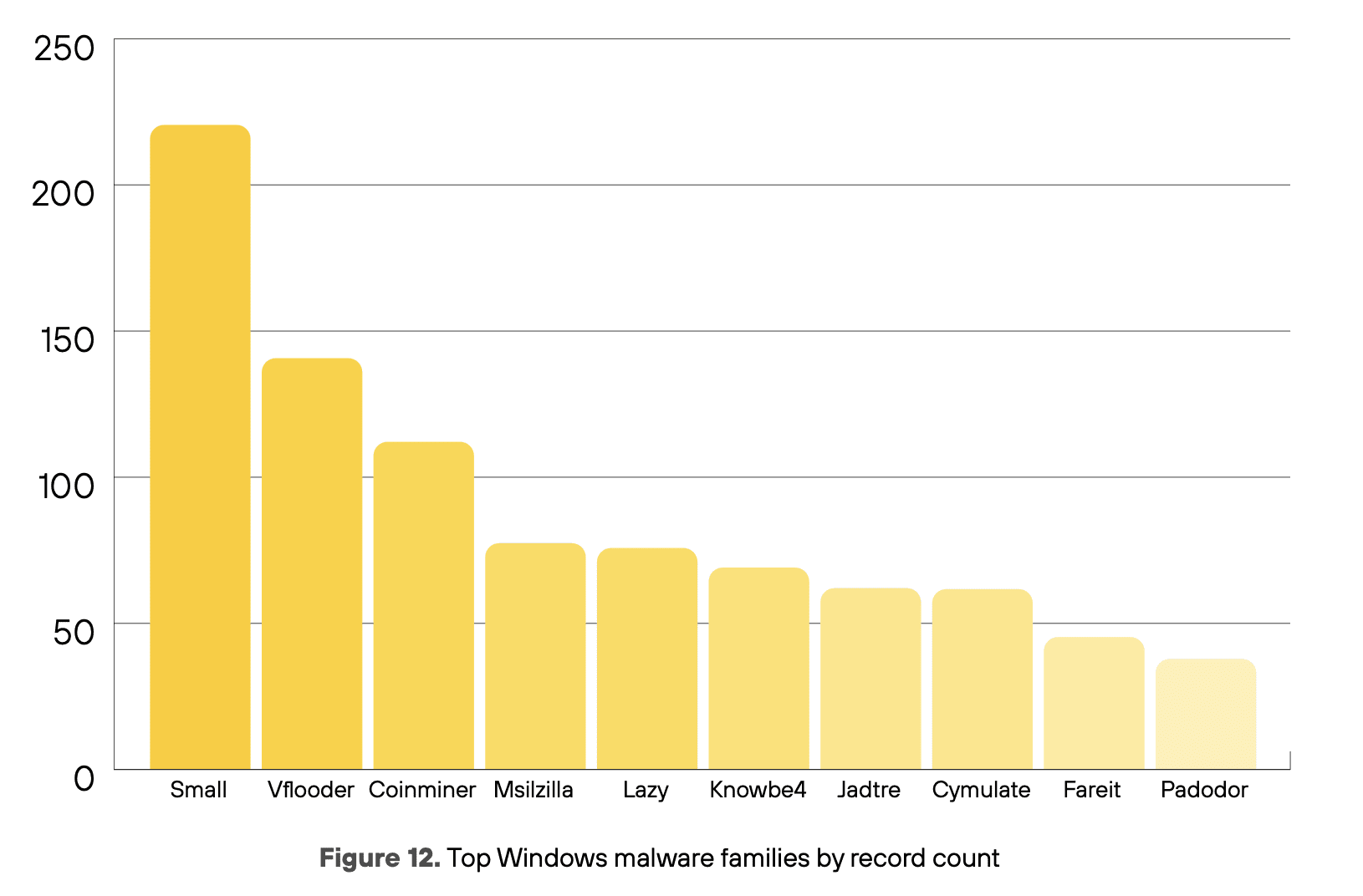 Tot slot namen de onderzoekers ook de aanvallers zelf onder de loep. Windows-toestellen blijven veruit het favoriete doelwit en zijn goed voor bijna 98 procent van alle malwareactiviteit. Linux volgt op 2 procent en MacOS op amper 0,2 procent. De meest voorkomende malwarefamilies zijn Small, Vflooder en Coinminer, vaak gelinkt aan het stelen van logingegevens, illegale cryptomining of DDoS-aanvallen.