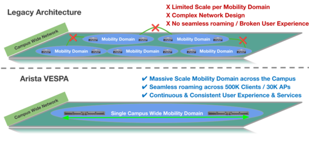 Arista VESPA pakt de kritieke schaalbaarheidslimieten aan waarmee grote organisaties te maken krijgen bij hun exponentiële groei van het aantal clients en IoT-apparaten. Door de consistente, grootschalige technologieën die in datacenters worden gebruikt, toe te passen in campusnetwerken, stelt Arista VESPA klanten in staat om enorme domeinnetwerken voor Wi-Fi-roaming te ontwerpen met meer dan 500.000 clients. Dit garandeert een veerkrachtige sub-second failover architectuur, terwijl de complexiteit in architectuur en hardwareafhankelijkheid van traditionele controllergebaseerde oplossingen worden weggenomen.