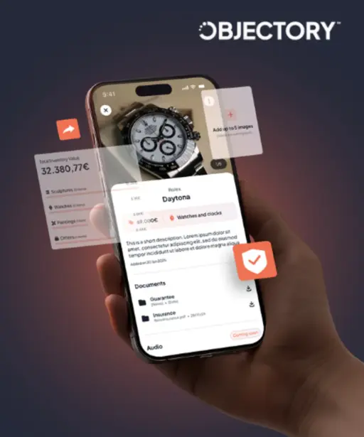 Met zijn app, een digitale kluis die toegankelijk is via smartphone, biedt Objectory een innovatieve, veilige en intuïtieve oplossing voor het documenteren, beheren, beschermen en overdragen van waardevolle voorwerpen. Met de app kan een gestructureerde en evolutieve inventaris worden opgesteld, met gedetailleerde beschrijvingen, herkomst, aankoopgeschiedenis, schattingen, certificaten, facturen en media in hoge resolutie (foto’s, video’s, spraakberichten).