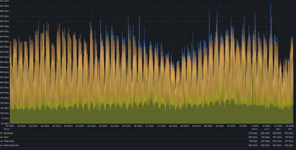 Na een lichte daling in 2024 steeg het internetverkeer op het Belgische internetknooppunt BNIX afgelopen jaar weer sterk. Met een gemiddelde trafiek van 288 gigabit per seconde en een maximumpiek van 642 Gbit/s was 2025 zelfs een absoluut recordjaar. Opvallend is ook dat de dip in de zomervakantie dit jaar terug is van (even) weggeweest, en dat de trafiek op werkdagen meer dan ooit een plateau vertoont van ‘s ochtends vroeg tot ’s avonds laat.